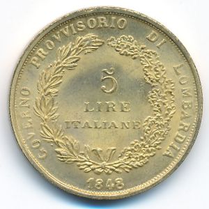 X#45a Nord., 5 lire Brass, 37.6 mm., 24.07 g. Категории:. «GOVERNO PROVVISORIO DI LOMBARDIA 1848 5 LIRE ITALIANE». «LEGA LOMBARDA LEGA NORD». Italy. Unusual. Информация о выпуске (подробности в каталоге):