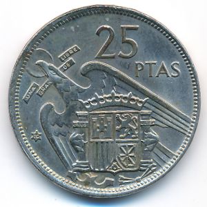 KM#787 Spain, 25 pesetas Copper-Nickel, 26.5 mm., 8.5 g. Категории:. Ruler: Caudillo and regent. Obv: Head right. Rev: Crowned shield within flying bird. Edge: UNA GRANDE LIBRE. Note: Values in uncirculated drop by 50% or more when the “PLUS” in legend is not readable. This defect is most often seen on coins struck before 1968. Информация о выпуске (подробности в каталоге):