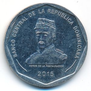 KM#107 Dominican Republic, 25 pesos Copper-Nickel, 28.82 mm., 8.56 g. Категории:. Edge Type: Reeded. Description Obverse: Value at left of national arms. Description Reverse: Bust of General Luperon facing. Legend Obverse: REPUBLICA DOMINICANA. Legend Reverse: BANCO CENTRAL DE LA REPUBLICA DOMINICANA. Информация о выпуске (подробности в каталоге):