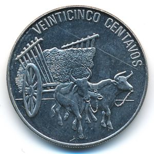 KM#71.1 Dominican Republic, 25 centavos (1991 г.) Nickel Clad Steel, 24.2 mm., 5.7 g. Категории:. Subject: Native Culture. Obv: National arms, date below. Rev: Two oxen pulling cart, denomination above. Смотрите подробное описание типа в каталоге.