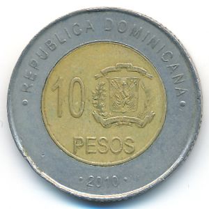 KM#106 Dominican Republic, 10 pesos (2010 г.) Bi-metallic, 26.93 mm., 8.05 g. Категории:. Obv: Value at left of national arms. Rev: Bust of General Mella facing. Смотрите подробное описание типа в каталоге.