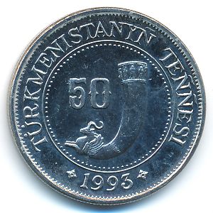 KM#5 Turkmenistan, 50 tenge Nickel Plated Steel, 24 mm., 4.9 g. Категории:. Obv: Value above animal leaning on horn at right. Rev: Head of President Saparmyrat Nyyazow left. Edge: Plain. Информация о выпуске (подробности в каталоге):