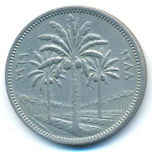 KM#128 Iraq, 50 fils (1969 г.) Copper-Nickel, 23 mm., 5.54 g. Категории:. Obv: Value within circle above sprigs, legend above. Rev: Palm trees divide dates. Смотрите подробное описание типа в каталоге.