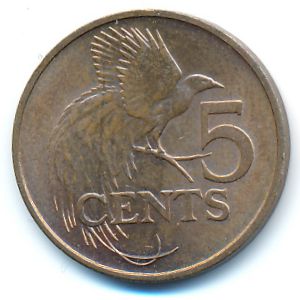 KM#30 Trinidad & Tobago, 5 cents Bronze, 21.2 mm., 3.31 g. Категории:. Obv: National arms. Rev: Bird of paradise and value. Edge: Plain. Информация о выпуске (подробности в каталоге):