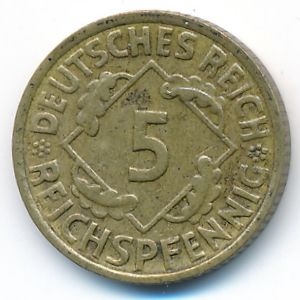 KM#39 Weimar Republic, 5 reichspfennig (1935 г.) Aluminum-Bronze, 2.54 g. Категории:. Obv: Denomination within square, oak leaf on each side. Rev: Six grain sprigs form center triangle above date. Смотрите подробное описание типа в каталоге.