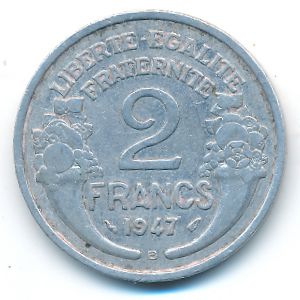 KM#886a.2 France, 2 francs (1947 г.) Aluminum, 27 mm., 2.2 g. Категории:. Mint Beaumont - Le Roger. Description Obverse: Laureate head left. Description Reverse: Denomination and date flanked by cornucopias. Designer Obverse: Morlon. Designer Reverse: Morlon. Смотрите подробное описание типа в каталоге.