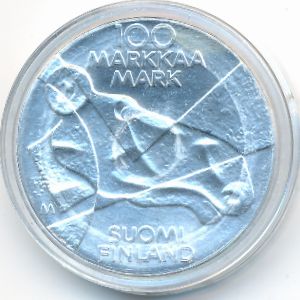 KM#75 Finland, 100 markkaa (1989 г.) 0.8300 Silver, 24 g. Категории:. Subject: Pictorial Arts of Finland. Obv: Artistic design, denomination above. Rev: Two figures holding artists palette, date at right. Designer: Reijo Paavilainen. Смотрите подробное описание типа в каталоге.