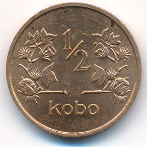 KM#7 Nigeria, 1/2 kobo (1973 г.) Bronze, 3.53 g. Категории:. Description Obverse: Arms with supporters. Description Reverse: Value flanked by cotton plant. Designer Reverse: Geoffrey Colley. Смотрите подробное описание типа в каталоге.