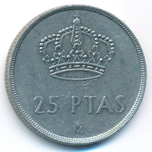 KM#824 Spain, 25 pesetas (1984 г.) Copper-Nickel, 26.5 mm., 8.5 g. Категории:. Ruler: Juan Carlos I. Obv: Head left. Rev: Crown above value. Edge: Reeded. Note: Mint mark: Crowned M; Similar to KM#808. Смотрите подробное описание типа в каталоге.