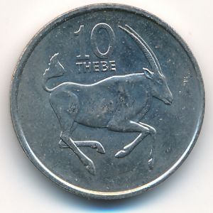 KM#5 Botswana, 10 thebe (1989 г.) Copper-Nickel, 22 mm., 4 g. Категории:. Obv: National arms, date below. Rev: South African Oryx right, denomination above. Rev. Designer: Mike Hibbit. Edge: Reeded. Смотрите подробное описание типа в каталоге.