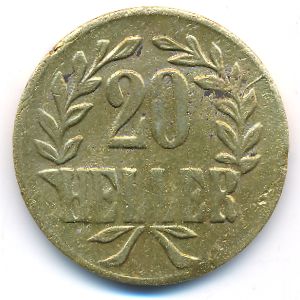 KM#15a German East Africa, 20 heller (1916 г.) Brass, 28 mm. Категории:. Edge Type: Plain. Description Obverse: Crown with ribbon above date Description Reverse: Denomination within wreath Notes: Tabora Emergency Issue. Смотрите подробное описание типа в каталоге.