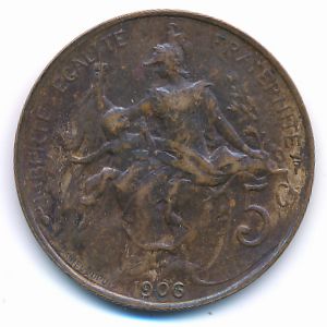 KM#842 France, 5 centimes (1906 г.) Bronze, 25.1 mm., 5 g. Категории:. Obv: Liberty head right. Rev: Republic protecting her child, denomination at right, date below. Note: Without mint mark. Смотрите подробное описание типа в каталоге. Уточните информацию о наличии этого товара по телефону +7 495 925-96-98.