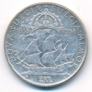 KM#807 Sweden, 2 kronor 0.8000 Silver, 31 mm., 15 g. Категории:. Ruler: Gustaf V. Subject: 300th Anniversary - Settlement of Delaware. Obv: Head left. Rev: The ship “Calmare Nyckel”. Информация о выпуске (подробности в каталоге):