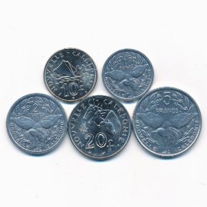 Набор из 5 монет Новой Каледонии. Номиналами 1 франк, 2 франка, 5 франков, 10 франков, 20 франков.