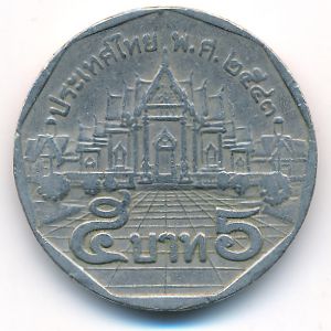 Y#219 Thailand, 5 baht (2000 г.) Copper-Nickel Clad Copper, 24 mm., 7.46 g. Категории:. Ruler: Bhumipol Adulyadej (Rama IX). Obv: Head left. Rev: Penjahwat. Edge: Coarse reeding. Смотрите подробное описание типа в каталоге.