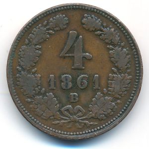 KM#2194 Austria, 4 kreuzer (1861 г.) Copper Категории:. Description Obverse: Crowned imperial double eagle. Description Reverse: Denomination and date within wreath. Ruler: Franz Joseph I. Смотрите подробное описание типа в каталоге. Уточните информацию о наличии этого товара по телефону +7 495 925-96-98.