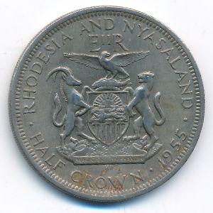 KM#7 Rhodesia and Nyasaland, 1/2 crown (1955 г.) Copper-Nickel Категории:. Ruler: Elizabeth II Obv: Bust right Rev: Arms with supporters Смотрите подробное описание типа в каталоге.