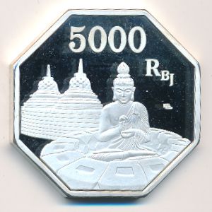 Java., 5000 rupees (2018 г.) Silver Plated Brass, 40 mm., 33 g. Категории:. Unusual. Sultanate of Yogyakarta. Obverse: coat of arms, part of the Prambanan temple complex. Reverse: 5000 rupees, bank of Java, Buddhist stupas of Borobudur temple complex. Indonesia. Смотрите подробное описание типа в каталоге.
