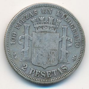 KM#654 Spain, 2 pesetas (1869 г.) 0.8350 Silver, 10 g. Категории:. Note: Mint mark: 6-pointed star. Смотрите подробное описание типа в каталоге. Уточните информацию о наличии этого товара по телефону +7 495 925-96-98.