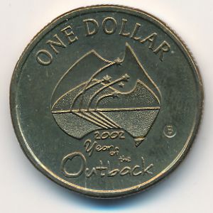 KM#600.1 Australia, 1 dollar (2002 г.) Aluminum-Bronze, 25 mm., 9 g. Категории:. Subject: Year of the Outback. Obv: Head with tiara right. Obv. Designer: Ian Rank-Broadley. Rev: Stylized map of Australia. Rev. Designer: Wojciech Pietranik. Edge: Segmented reeding. Смотрите подробное описание типа в каталоге. Уточните информацию о наличии этого товара по телефону +7 495 925-96-98.