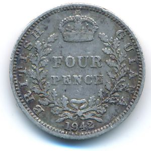 KM#30 British Guiana, 4 pence (1942 г.) 0.9250 Silver, 1.8851 g. Категории:. Obv: Crowned head left. Rev: Crowned denomination within wreath. Смотрите подробное описание типа в каталоге.