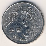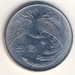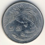 KM#25 South Korea, 1000 won Nickel, 33 mm., 17 g. Subject: 1st Anniversary of the 5th Republic. Obv: Yin-yang symbol within rectangle above value flanked by flames. Rev: Imaginary bird called Bong-hwang who represents a King. |
