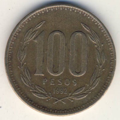 Чили, 100 песо (1992 г.) Посмотреть подробную информацию о Чили, 100 песо (1992 г.) Посмотреть очень большое изображение Чили, 100 песо (1992 г.) Посмотреть другие изображения