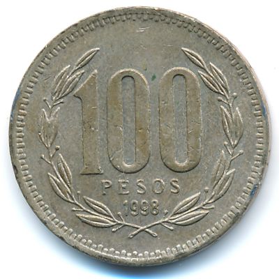Чили, 100 песо (1998 г.) Посмотреть подробную информацию о Чили, 100 песо (1998 г.) Посмотреть очень большое изображение Чили, 100 песо (1998 г.) Посмотреть другие изображения
