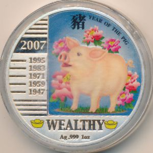 Ниуэ, 1 доллар 0.9250 Серебро, 38.6 мм, 31.28 г Категории: Животные, Лунный календарь, Растения, Цветные, Юбилейные. Серия: лунный календарь. Год свиньи. Богатство. Информация о выпуске (подробности в каталоге):