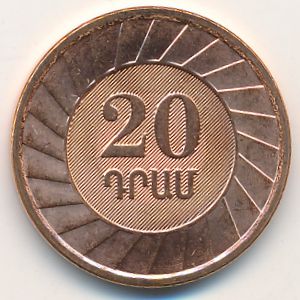 KM#93 Армения, 20 драмов Медь-Сталь, 20.5 мм, 2.8 г Категории: Без тематики. Аверс: В центральном круге герб Республики Армения, под ним год чеканки. На внешнем круге вверху полукругом надпись: ՀԱՅԱՍՏԱՆԻ ՀԱՆՐԱՊԵՏՈՒԹՅԱՆ ԿԵՆՏՐՈՆԱԿԱՆ ԲԱՆԿ (ЦЕНТРАЛЬНЫЙ БАНК РЕСПУБЛИКИ АРМЕНИЯ), внизу полукругом - ՔՍԱՆ ԴՐԱՄ (ДВАДЦАТЬ ДРАМОВ) с двумя разделительными точками. Реверс: В центральном круге на рифленом по диагонали фоне номинал в две строки 20 ԴՐԱՄ (20 ДРАМОВ), на внешем круге стилизованный орнамент. Информация о выпуске (подробности в каталоге):