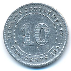 KM#11 Стрейтс-Сетлментс, 10 центов 0.8000 Серебро, 2.71 г Категории: Без тематики. Королева Виктория. Информация о выпуске (подробности в каталоге):