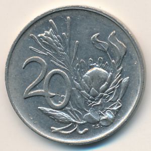 KM#86 ЮАР, 20 центов Никель, 24.2 мм, 6 г Категории: Растения. Реверс: Гигантская, или королевская, протея. Информация о выпуске (подробности в каталоге):