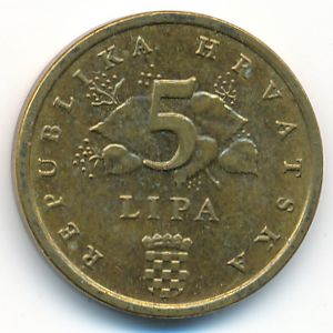 KM#5 Хорватия, 5 лип Латунь-Сталь, 17.99 мм, 2.54 г Категории: Растения. Примечание: монеты с датой "1993" без точки после даты. Информация о выпуске (подробности в каталоге):
