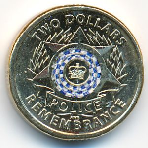 Австралия, 2 доллара Алюминий-Бронза, 20.5 мм, 6.6 г Категории: Цветные, Юбилейные. 30-летие Национального дня полиции. Аверс: портрет Ее Величества королевы Великобритании Елизаветы II работы Иена Рэнк-Бродли (Ian Rank-Broadley FRBS), вдоль канта расположена легенда - «ELIZABETH II», «AUSTRALIA 2019». Реверс: звезда Федеральной полиции Австралии (AFP) с короной в центре, с применением селективного окрашивания. По окружности отчеканено название памятного события - «ONE HUNDRED YEARS OF REPATRIATION» и номинальная стоимость монеты - «TWO DOLLARS». Информация о выпуске (подробности в каталоге):