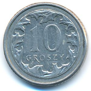 Аверс: в центре – герб страны: коронованный польский орел, под правой лапой орла – знак монетного двора Варшавы (M/W), под орлом – год выпуска. Круговая надпись: RZECZPOSPOLITA POLSKA. Надпись и дата разделены точками. Реверс: в круге из листьев – номинал в две строки: 10 GROSZY. Гурт: секторальное рифление.