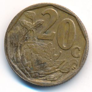 KM#328 ЮАР, 20 центов Бронза-Сталь, 19 мм, 3.5 г Категории: Растения. «Afrika Borwa» Реверс: Гигантская, или королевская, протея. Информация о выпуске (подробности в каталоге):