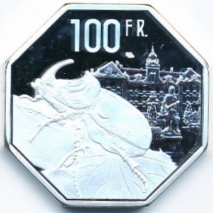 Вальтице., 100 франков Латунь, покрытая серебром, 43.5 мм, 31.96 г Категории: Unusual, Архитектура, Животные, Насекомые, Необычная форма. Жук-носорог. Лихтенштейн. Unusual. Монетовидный жетон. 43.5 х 40 мм. Лихтенштейн. Информация о выпуске (подробности в каталоге):