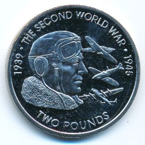Океанские Территории, 2 фунта Медь-Никель, 38.6 мм, 28.28 г Категории: Авиация, Военное дело, Вторая мировая, Выдающиеся личности, Транспорт, Самолёты, Юбилейные. 80-я годовщина начала Второй мировой войны. Аверс: портрет Ее Величества королевы Великобритании Елизаветы II. По краю аверса расположена легенда: «ELIZABETH II • 2019 • BRITISH INDIAN OCEAN TERRITORY • ». Здесь же расположен знак монетного двора «PM». Реверс: британский летчик, а также три самолета - Ураган , Спитфайр и Ланкастер. Надписи - «1939 ●THE SECOND WORLD WAR ● 1945» и номинал – «TWO POUNDS». Информация о выпуске (подробности в каталоге):