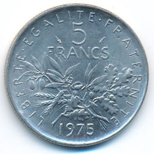 KM#926a.1 Франция, 5 франков Медь-Никель, плакированный никелем, 29 мм, 10 г Категории: Без тематики. Гурт: рубчатый. Информация о выпуске (подробности в каталоге):