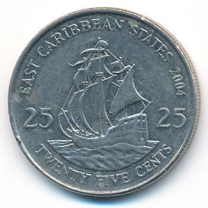 KM#25 Восточные Карибы, 25 центов Медь-Никель, 23.98 мм, 6.48 г Категории: Транспорт, Корабли. Корабль Golden Hind Сэре Френсиса Дрейка. Королева Елизавета II. Информация о выпуске (подробности в каталоге):