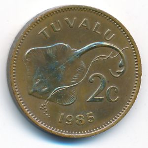 KM#2 Тувалу, 2 цента (1985 г.) Бронза, 21.6 мм, 5.2 г Категории: Животные. Аверс: Елизавета II. Реверс: Электрический скат. Смотрите подробное описание типа в каталоге.