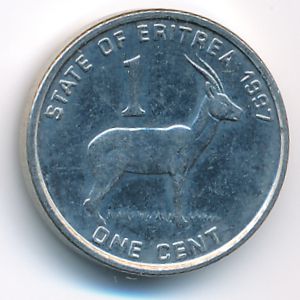 KM#43 Эритрея, 1 цент (1997 г.) Сталь, плакированная никелем, 17 мм, 2.2 г Категории: Военное дело, Животные, Исторические сражения, Юбилейные. Аверс: Изображение антилопы; номинал. Реверс: Изображение эритрейских партизан, водружающих флаг независимости 24 мая 1991 года, после освобождения Амэры, столицы Эритреи, от войск Эфиопии. Смотрите подробное описание типа в каталоге.