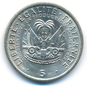 KM#119 Гаити, 5 сентим (1975 г.) Медь-Никель, 20 мм, 2.7 г Категории: ООН, ФАО, Юбилейные. F.A.O. (Продовольственная и сельскохозяйственная организация ООН). FAO, ФАО. «AUGMENONS LA PRODUCTION ALIMENTAIRE». Смотрите подробное описание типа в каталоге.
