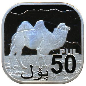 Республика Уйгурстан., 50 пул Латунь, покрытая серебром, 39 мм, 35.5 г Категории: Unusual, Животные, Юбилейные. ав: герб, рев: двугорбый верблюд (Camelus bactrianus). UNUSUAL Информация о выпуске (подробности в каталоге):
