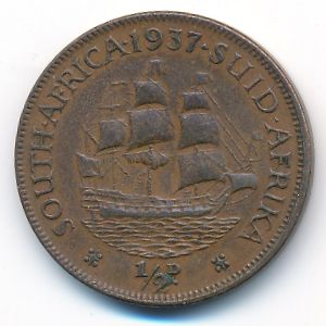 KM#24 ЮАР, 1/2 пенни (1937 г.) Бронза, 25.6 мм, 5.67 г Категории: Корабли, Транспорт. Аверс: Георг VI. Реверс: Парусный корабль «Дромедарис», на котором Ян ван Рибек впервые высадился на мысе Доброй Надежды в 1652 году. Смотрите подробное описание типа в каталоге. Уточните информацию о наличии этого товара по телефону +7 495 925-96-98.