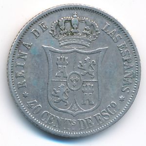 KM#648.2 Испания, 40 сентимо (1867 г.) 0.8100 Серебро, 5.192 г Категории: Без тематики. Смотрите подробное описание типа в каталоге. Уточните информацию о наличии этого товара по телефону +7 495 925-96-98.