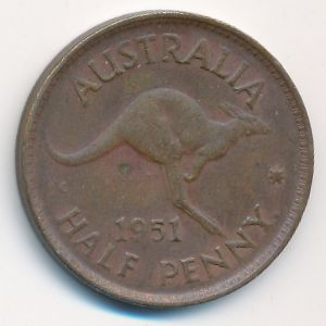KM#42 Австралия, 1/2 пенни (1951 г.) Бронза, 5.6 г Категории: Животные. Кенгуру. Различие тиражей: 1) PL справа от звездочки: монетный двор Лондона. 2) Точка после «PENNY». Смотрите подробное описание типа в каталоге. Уточните информацию о наличии этого товара по телефону +7 495 925-96-98.