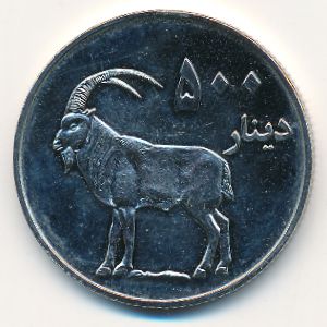 X#11 Курдистан., 500 динаров (2006 г.) Медь-Никель, 35 мм, 10.5 г Категории: Unusual, Животные, Юбилейные. Unusual. Безоаровый козёл Смотрите подробное описание типа в каталоге.