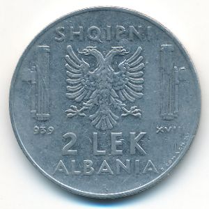 KM#32 Албания, 2 лека Нержавеющая сталь Категории: Без тематики. Монеты 1939 года существуют в двух вариантах: магнитные и обычные. Монеты 1940 и 1941 годов чеканились не для обращения. Итальянская оккупация . Информация о выпуске (подробности в каталоге):