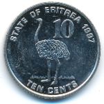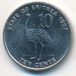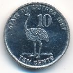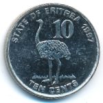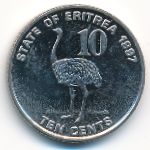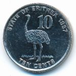 KM#45 Эритрея, 10 центов Сталь, плакированная никелем, 20.95 мм, 3.3 г Аверс: Изображение страуса; номинал. Реверс: Изображение эритрейских партизан, водружающих флаг независимости 24 мая 1991 года, после освобождения Амэры, столицы Эритреи, от войск Эфиопии. |